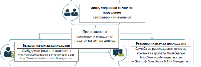 Допълнителна информация относно процедурните правила на механизма за подаване на сигнали за нередности на Volkswagen Group можете да намерите тук.