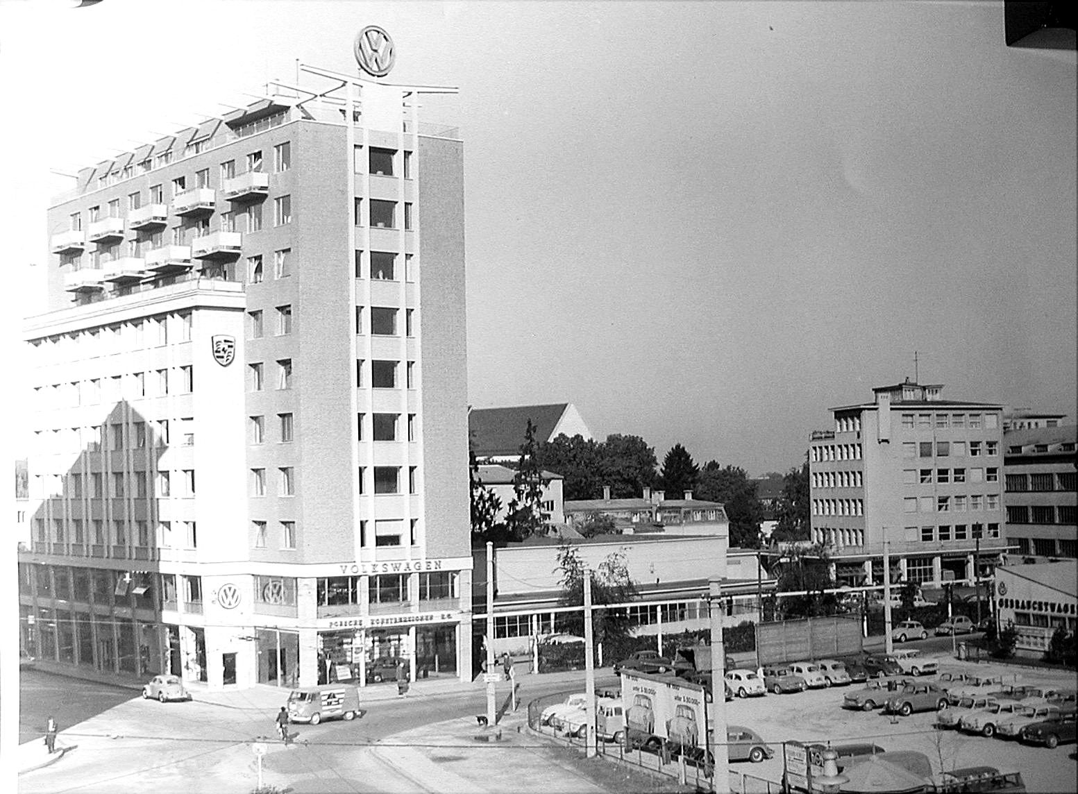 In 1956 the workshop at the railway station alongside the new customer service building were opened, which was dubbed “Porschehof I” and later nicknamed “the blue building”. In 1962 Porschehof II was built at Fanny-von-Lehnert Straße, and with its blue Volkswagen emblem on the roof signalled to all exactly where Volkswagen could be found in Salzburg.