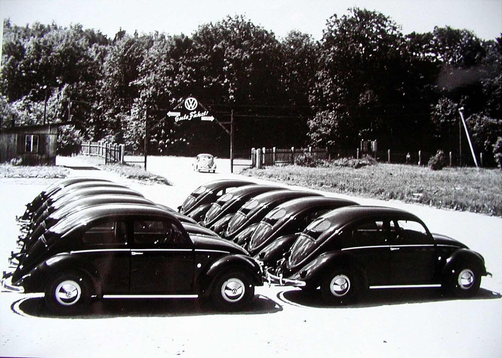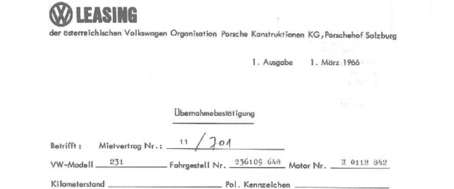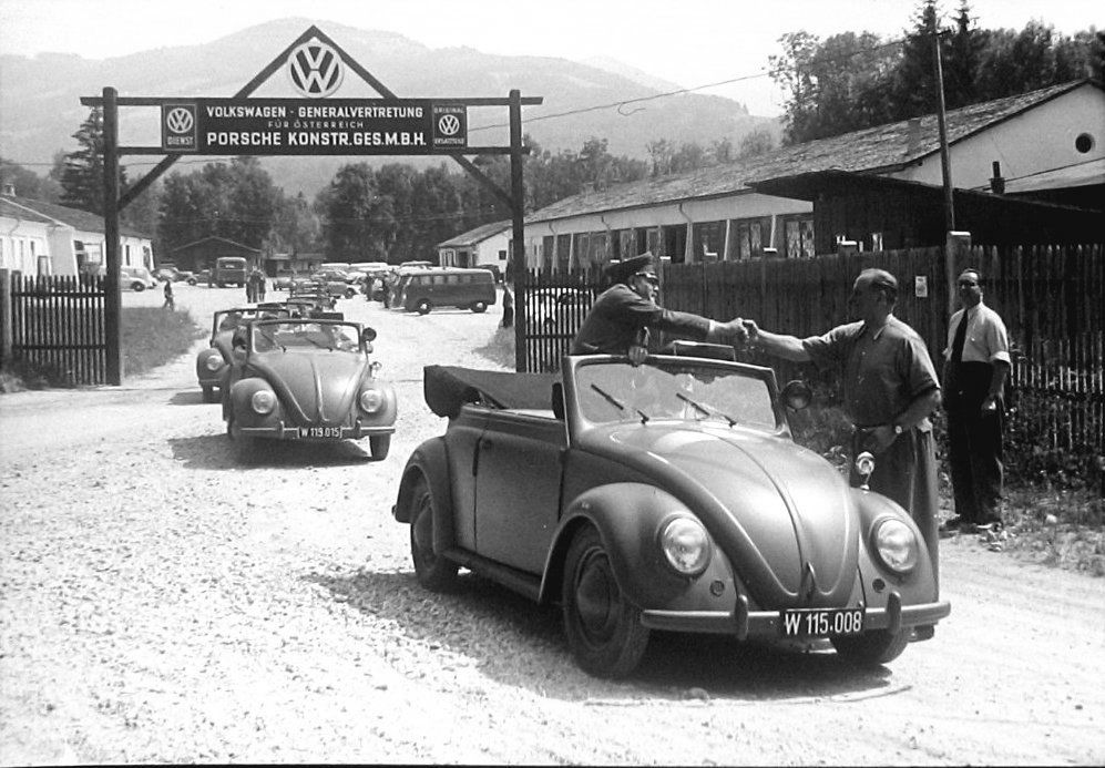The most momentous decision in company history, however, was made 1,000 km further north when the Allies decided to begin manufacturing Volkswagens at the newly reconstructed Volkswagen factory. Porsche engineers were in great demand to support the start-up. Concurrently, Ferry Porsche was entering into contractual negotiations with the newly appointed general director of Volkswagen, Heinrich Nordhoff. The most important parts of the contract were licence fees for every Beetle manufactured, approval to build a sports car based on the Beetle (the Porsche 356) and sales via what would later be the world-wide VW network, agreements for the Porsche design company’s technical services, and, lastly, authorisation to act as Volkswagen general importer in Austria. This wide-ranging contract was signed in Bad Reichenhall by Ferdinand Porsche, Ferry Porsche, Louise Piëch and Anton Piëch and by VW’s general director, Heinrich Nordhoff. The design by father Ferdinand Porsche of the VW Beetle thereby became the basis for the great success Porsche later enjoyed in Salzburg and in Stuttgart. On 7 September 1948 a trade licence was issued for “trade in commercial vehicles and parts, limited to products manufactured at the engine factory in Wolfsburg (later the Volkswagen factory)” in the name of Ferdinand Porsche, engineer, by the district administration in Spittal an der Drau.